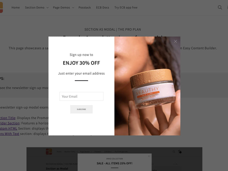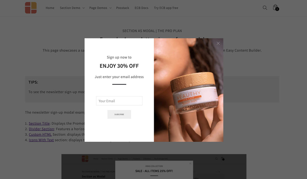 For instance, you can display a modal with two columns, presenting an image in one column and either a newsletter sign-up form or promotional information in the other column.